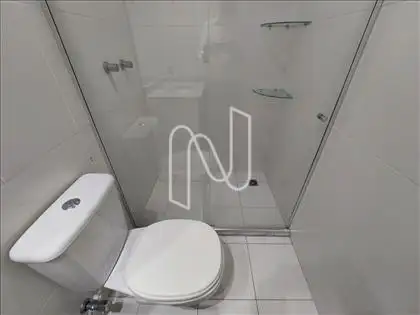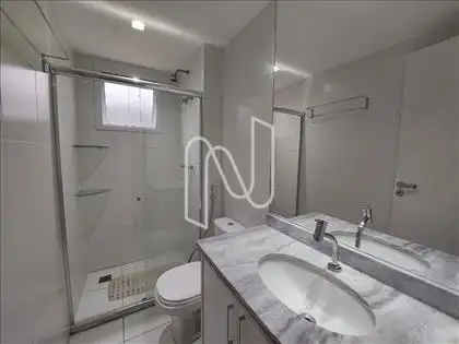 Banheiro suíte e social com piso em cerâmica, armários, box blindex, bancada em granito.