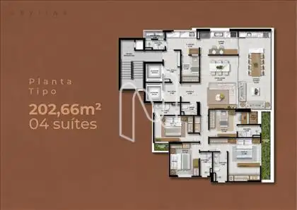 O Skyline Alpha Residence tem duas torres e um apartamento por andar. São unidades de 202,66m² com 04 suítes e varanda gourmet em uma planta espaçosa que garante privacidade pra cada membro da família, ao mesmo tempo que oferece amplo conforto nos momentos de interação, inclusive com convidados.